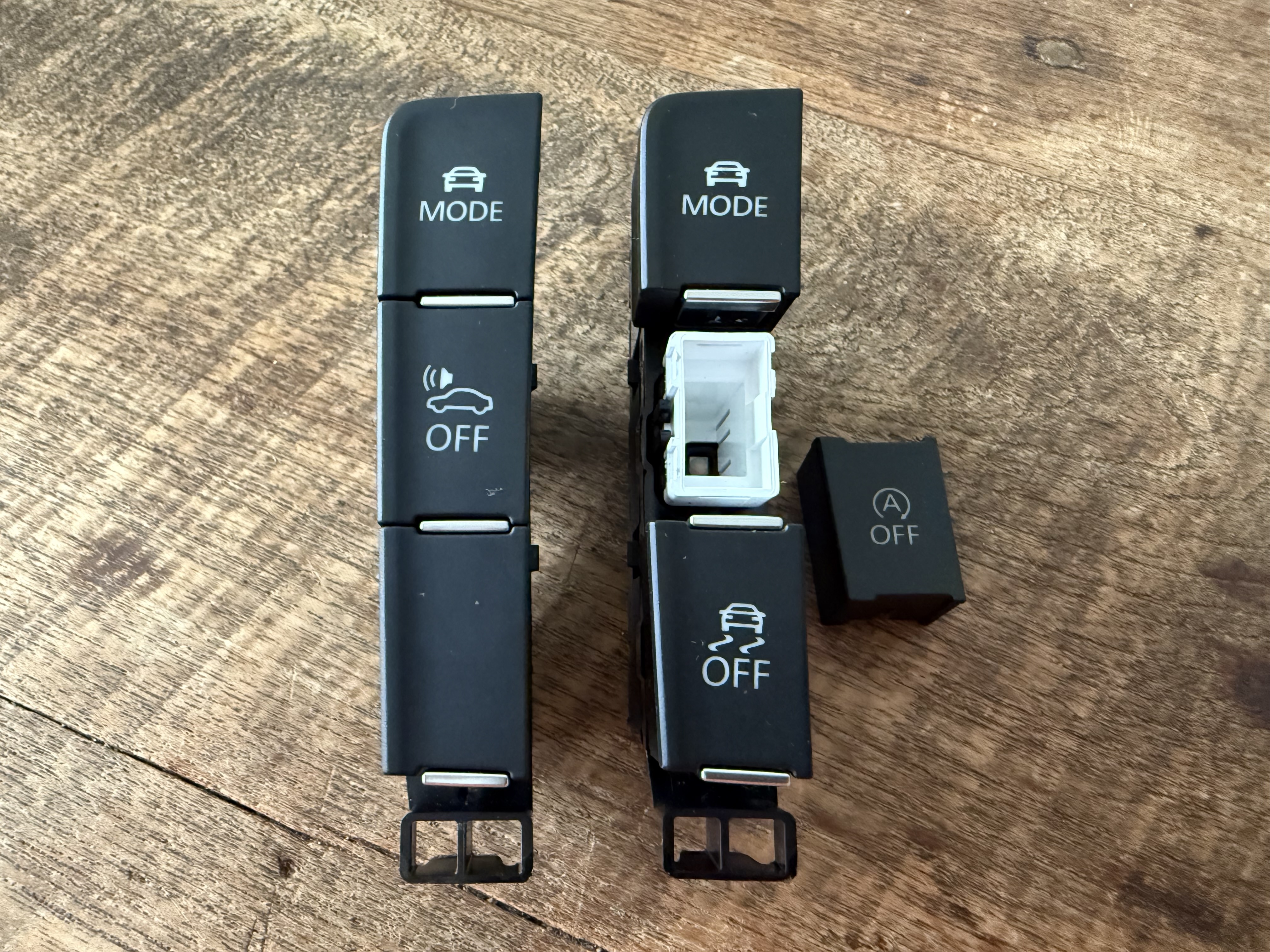 This means that I need the buttons with mode select, the speaker button and the ESC/ASR button. This button does not exist, because the e-Golf never had the ESC/ASR button. But these buttons are can be swapped, so I ordered two versions and swapped the middle button. This will work, because the start-stop has the LEDs installed, so it will light up when pressed.