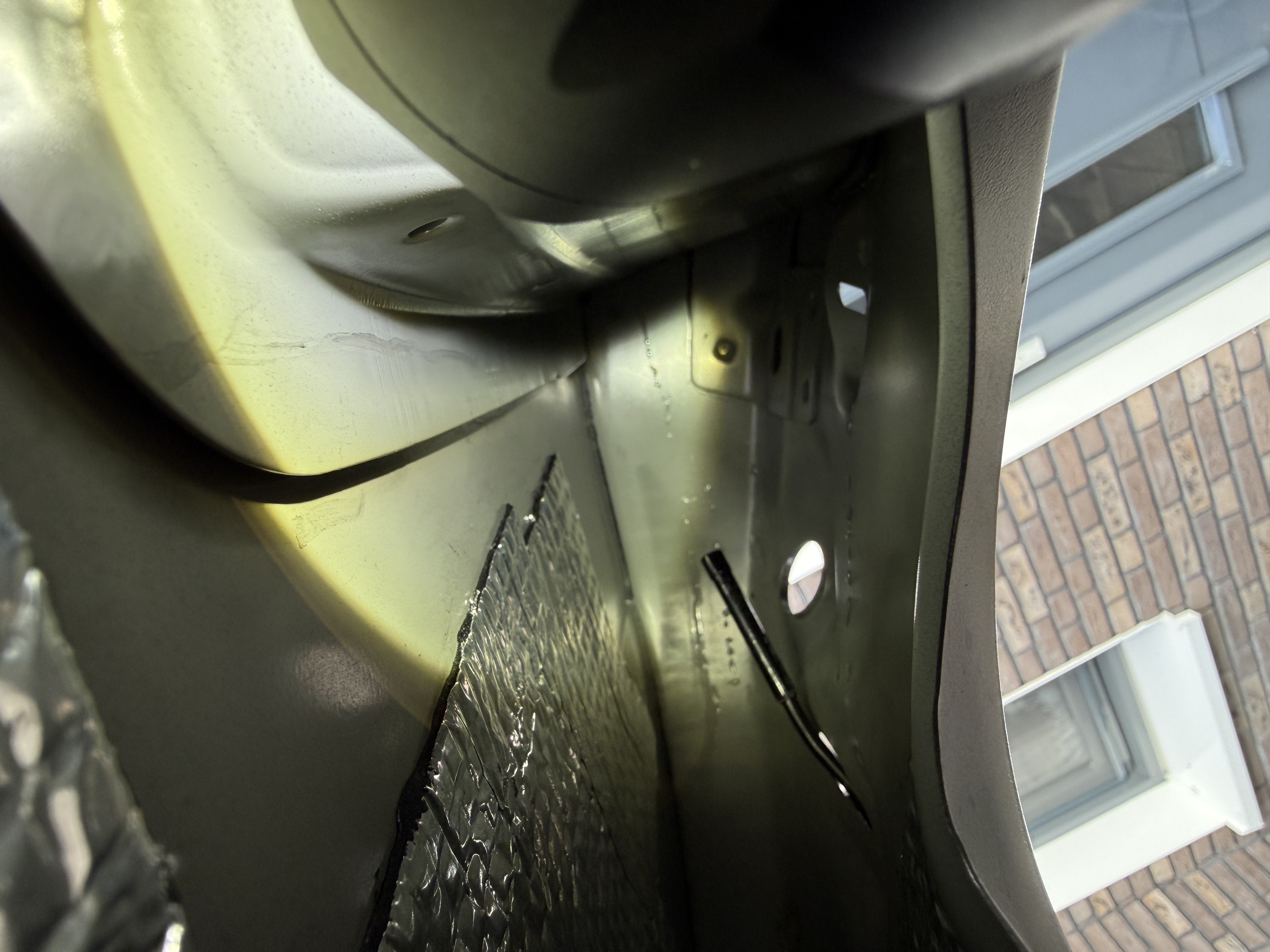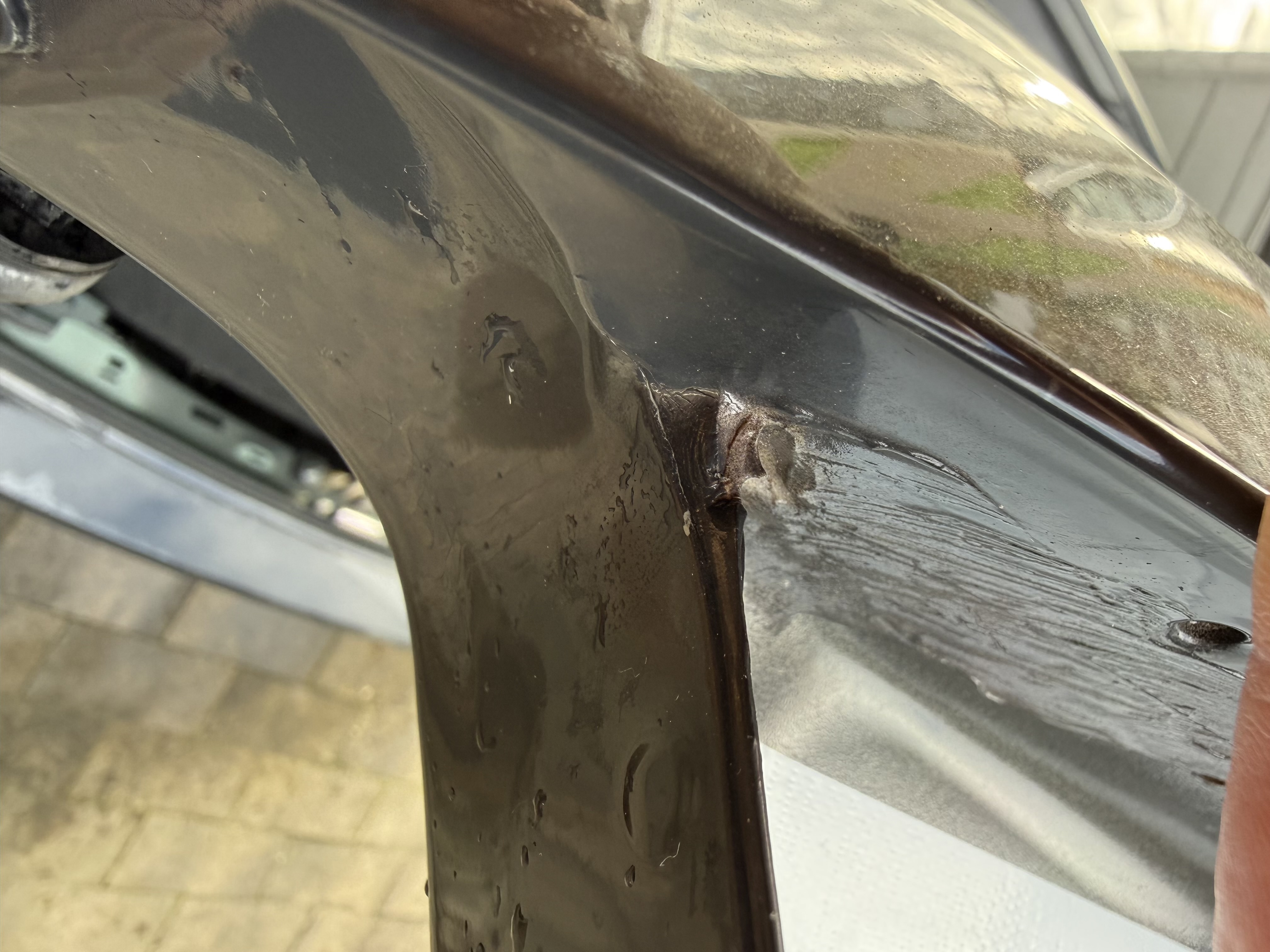 On a Saterday, I decided to give it one more go, and test it thoroughly. Using the boroscope camera, I inspected the inside of the trunk lid, and found an interesting brown/rusty spot. This makes sense: water would enter here, then run down between the pocket and the lid, and finally drip down inside the lower section of the trunk lid. After inspecting the outside, I noticed that the weld of that spot was looking bad, potentially broken. I’m 95% sure that this is how water is entering the trunk lid.