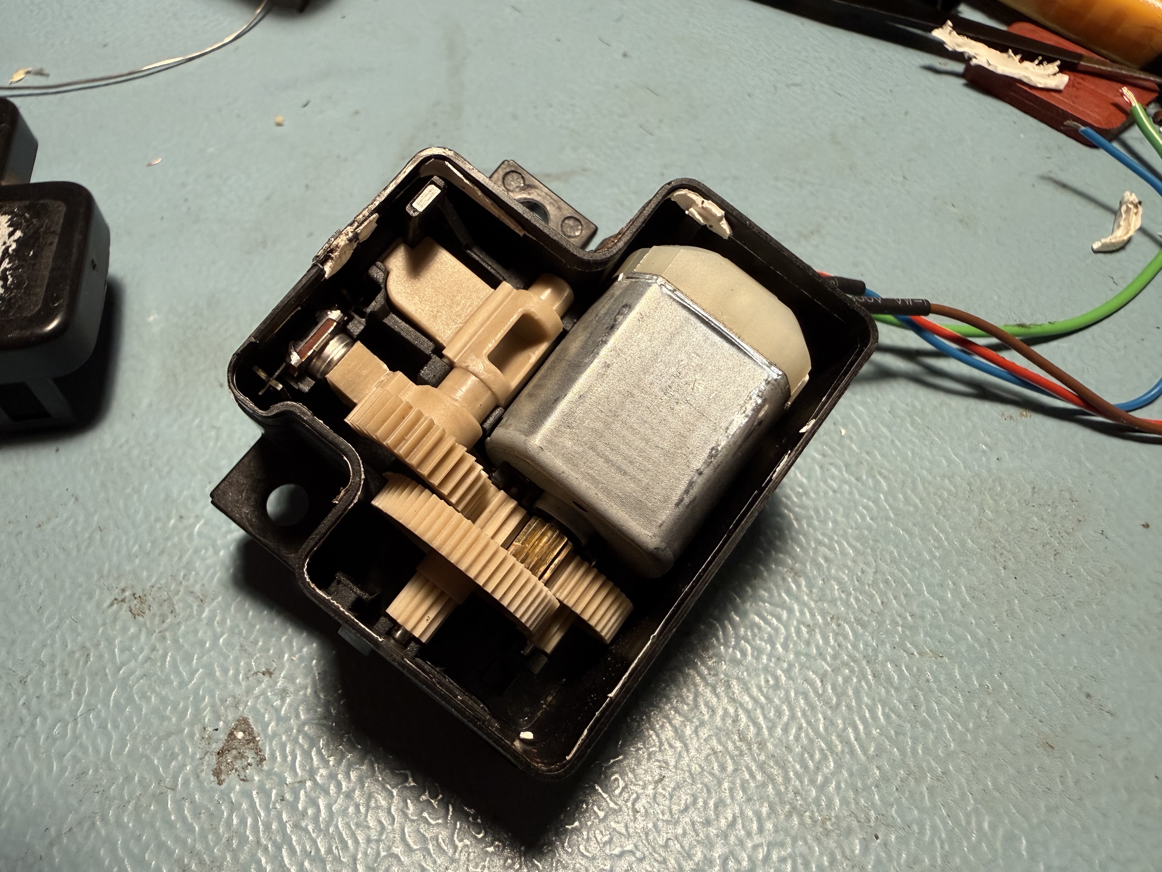 When I picked up the car, I asked if they still had the broken part. For such a price, I want to know the failure mode. Opening it up was easy, and it operates very simple: two wires are for power, and two wires are for signaling. A small cam is turned by the motor, which presses a microswitch on the start and end position. I believe that the controller will measure this, and expects a change of signal when the motor is powered.